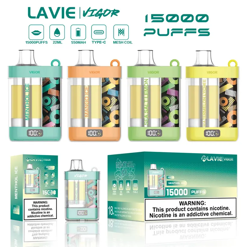 Lavie Vigor 15K Puffs 15000 cigarette électronique jetable avec 12 saveurs batterie 550mAh 22ml e liquide résistance mesh charge Type C vente en gros livraison gratuite vape douce au quotidien.