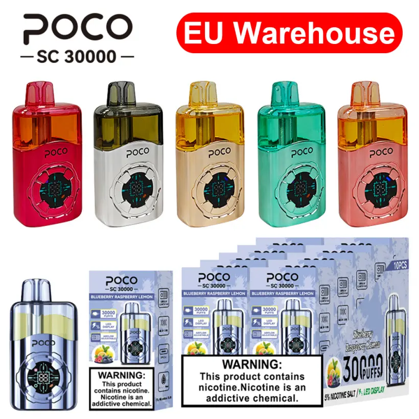 Le POCO SC 30000 Puffs Vape jetable offre une grande capacité de 30 ml de e-liquide et une batterie durable de 650 mAh avec charge Type-C. Doté d’une résistance mesh de 0,7 Ω et d’un écran intelligent affichant les niveaux d’huile et de batterie, il propose 15 délicieuses saveurs. Profitez d’une livraison rapide depuis l’UE et de la disponibilité en vente en gros.