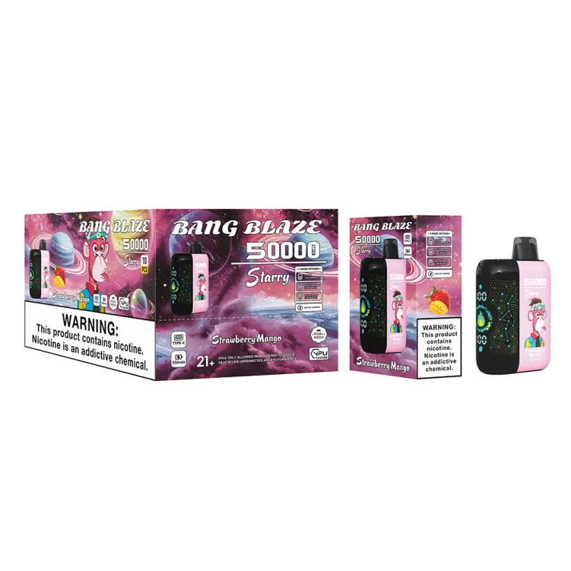La vape jetable Puff UE Bang Blaze 50000 bouffées est équipée d’une batterie de 550 mAh, d’une résistance mesh de 1,0 ohm et d’un port de charge Type-C. Elle propose 12 saveurs populaires. Emballage efficace pour la vente en gros : 10 pcs/boîte, 200 pcs/carton. Profitez de performances fiables et de la livraison gratuite pour cette vape jetable à haute autonomie.