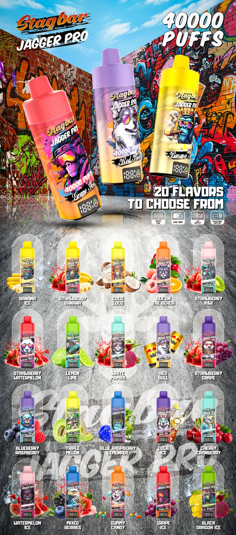 Stagbar Jagger Pro 40K Puffs 40000 cigarette électronique jetable avec 20 saveurs batterie 750mAh 36ml e liquide 1.0Ω résistance mesh charge Type C entrepôt UE vente en gros expérience de vape douce