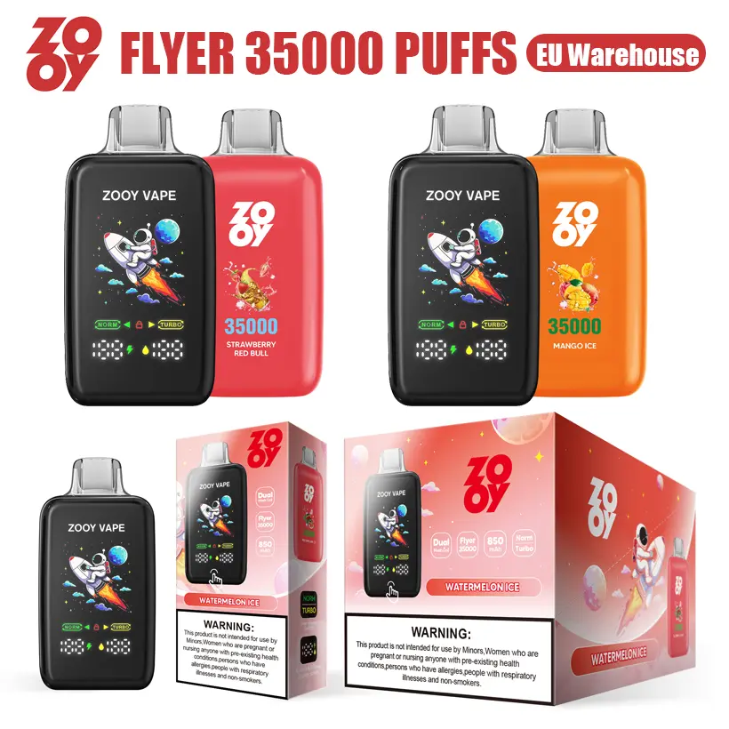 ZOOY FLYER 35K Puffs 35000 cigarette électronique jetable avec 10 saveurs, batterie 850mAh, résistance 0.8Ω double bobine Mesh, charge Type-C, écran intelligent. Entrepôt UE, vente en gros, expérience de vape douce.